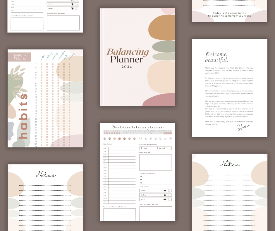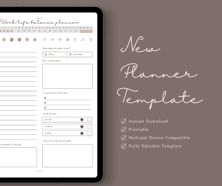 Our Work-Life Balancing Planner is designed to seamlessly integrate into your digital life. Compatible with popular note-taking apps and digital platforms, you can easily access and sync your planner across multiple devices, ensuring you stay organized and on track, no matter where you are.