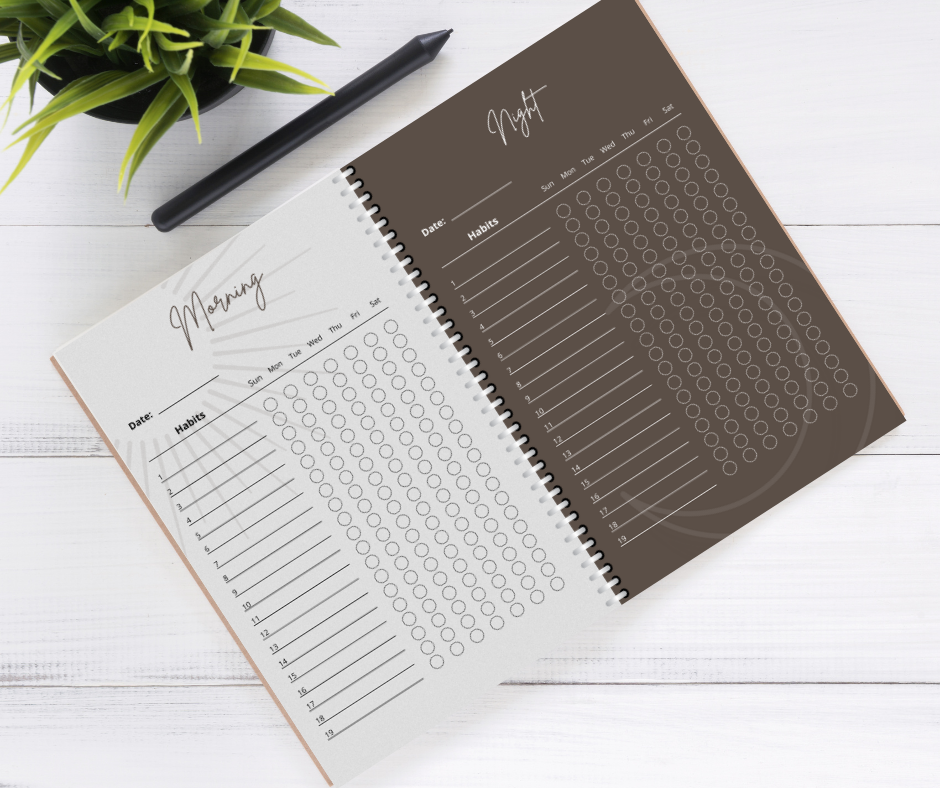 Structured Morning Routine: Kickstart your day with purpose by setting goals, listing priorities, and tracking habits that promote positivity and productivity. Our planner provides dedicated sections to plan your morning rituals, including meditation, exercise, journaling, and more.